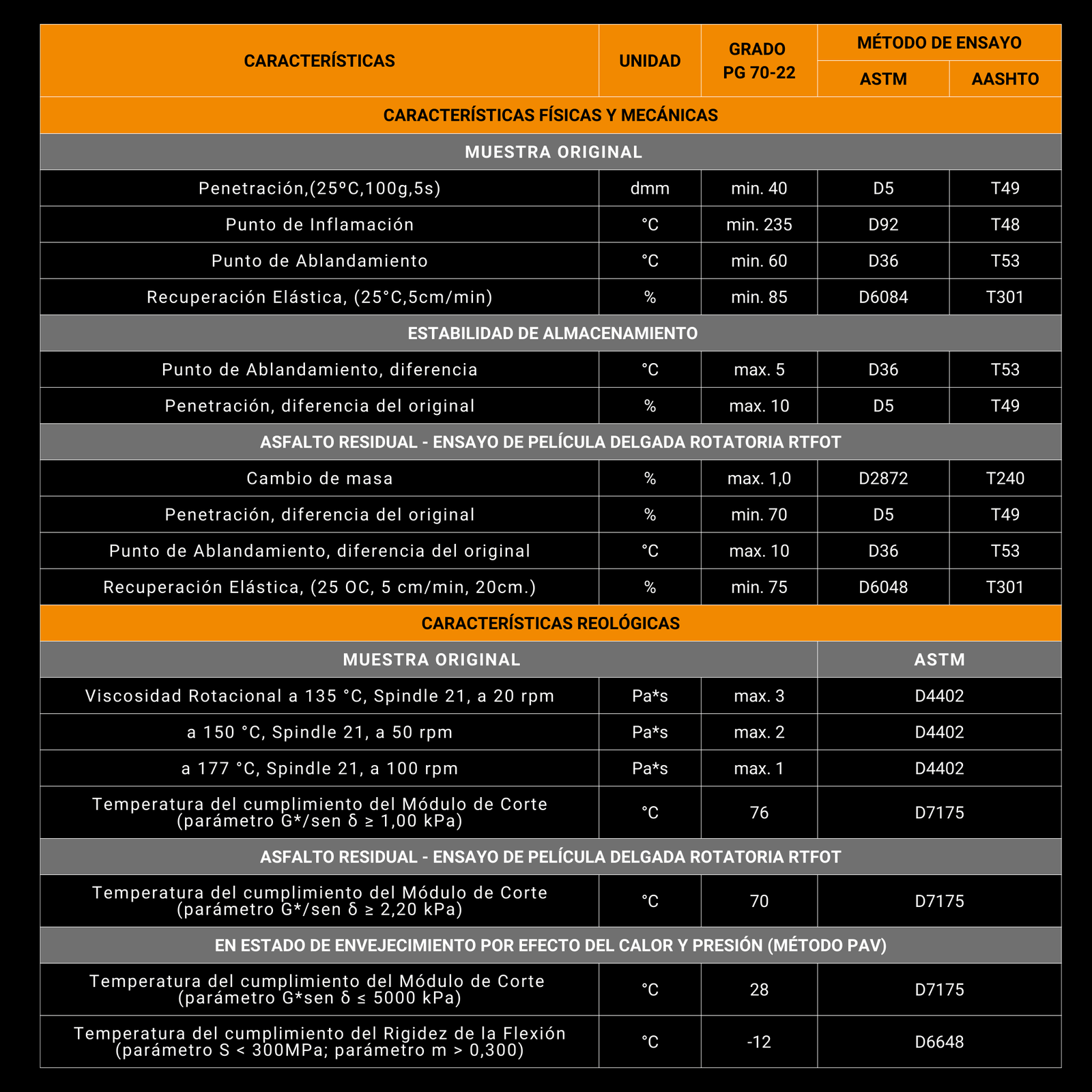 El cemento asfáltico modificado con polímero SBS, con grado de desempeño PG 76-22 de acuerdo con los requisitos de las normas AASHTO M320 y ASTM D6373. Se utiliza para la elaboración de mezclas asfálticas en caliente para construcción de pavimentos flexibles, que operan en climas de -28 a 76 °C, con la intensidad del tránsito Muy Alta o Extremadamente Alta. Un PG 76-28 garantiza la resistencia de los pavimentos a cargas de tráfico elevadas, garantizando una vida útil del pavimento mayor a diez años.