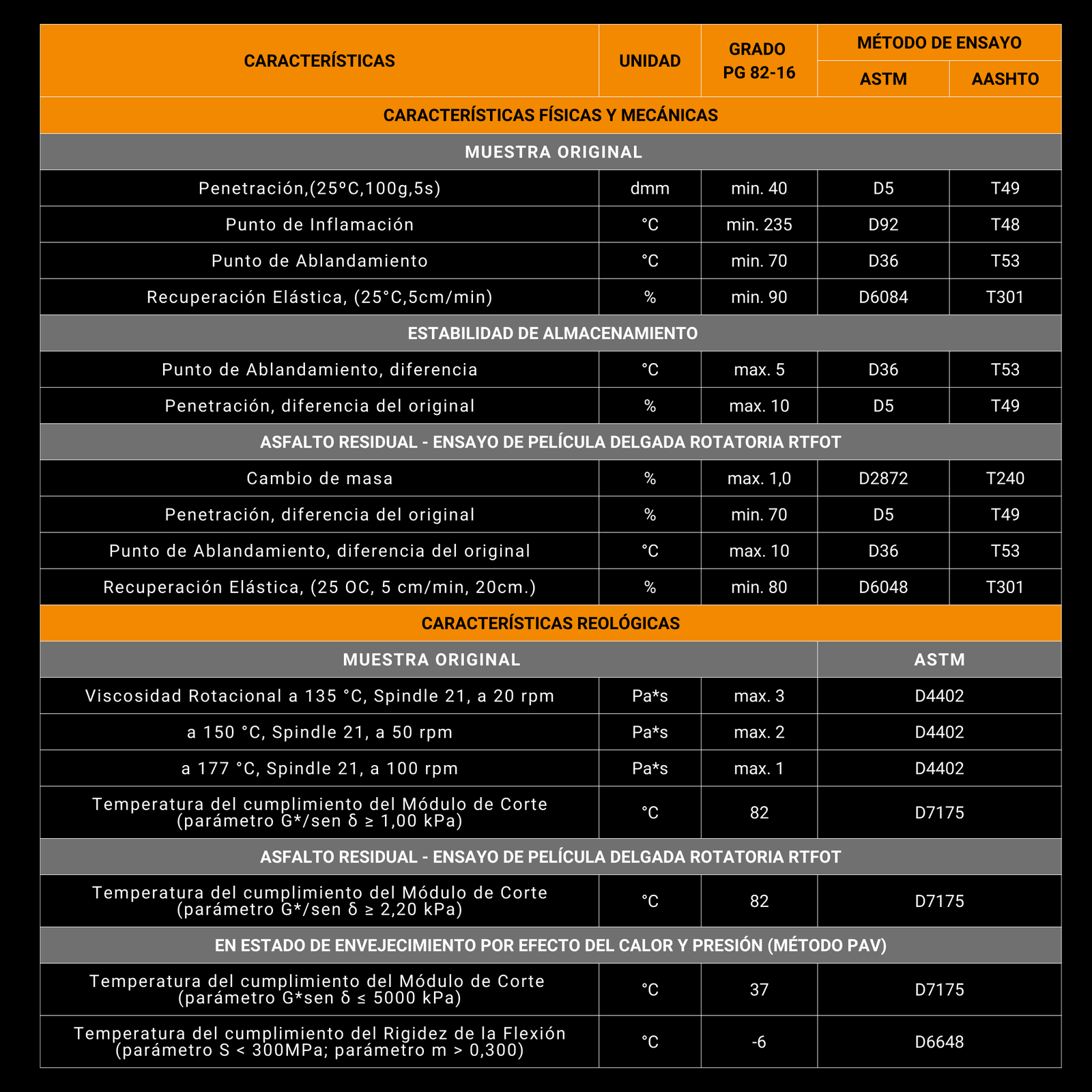 4. Aplicaciones: Ideal para autopistas, intersecciones, aeropuertos y otras áreas con alta demanda mecánica y térmica. El PG 82-16 es una solución eficiente y confiable para pavimentos que requieren máxima resistencia, estabilidad y durabilidad frente a condiciones adversas.