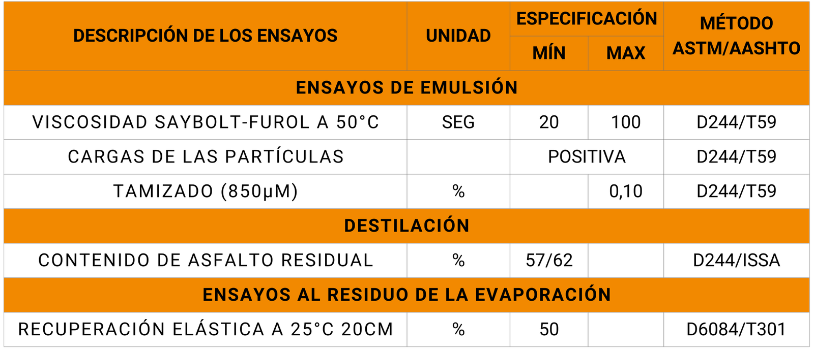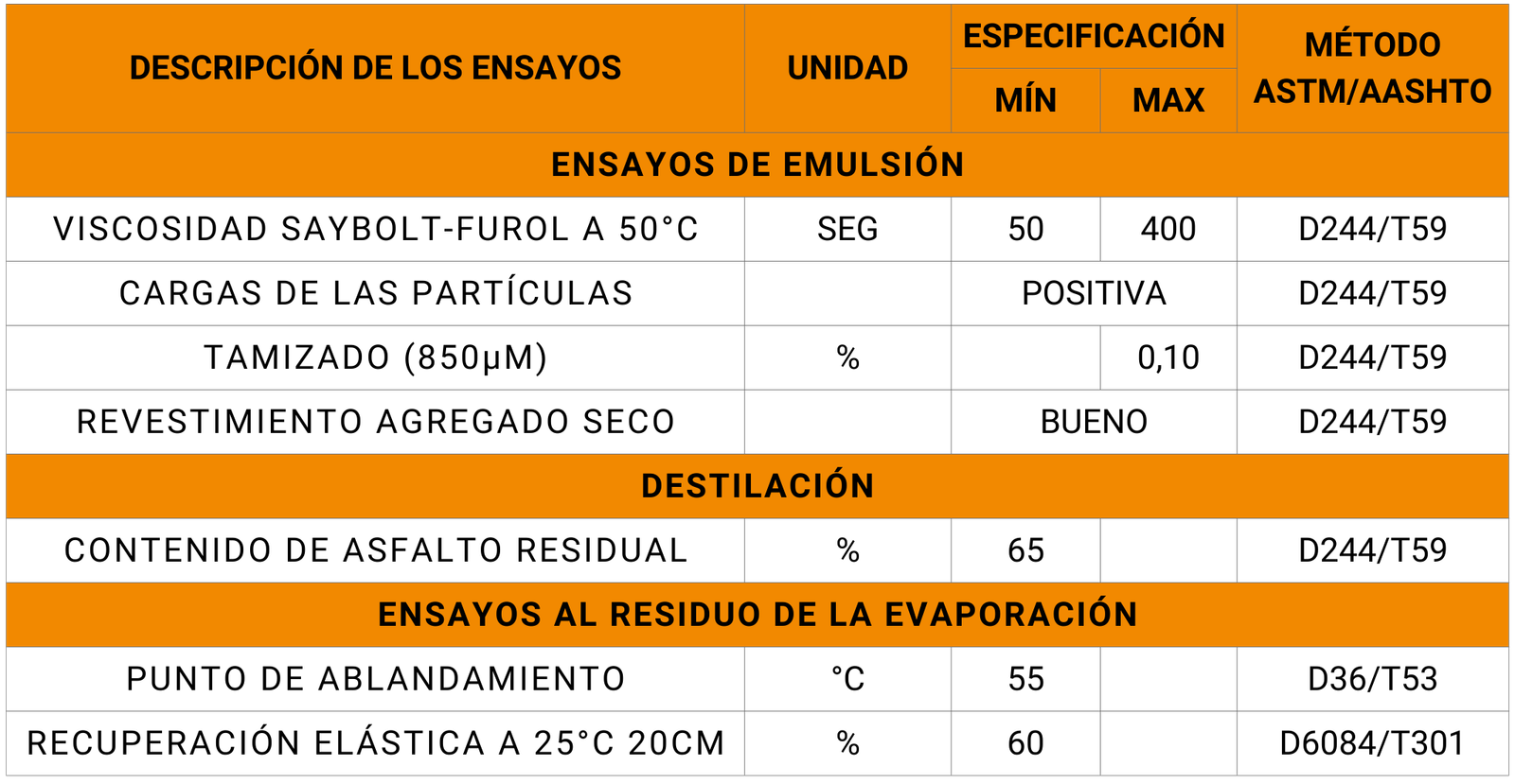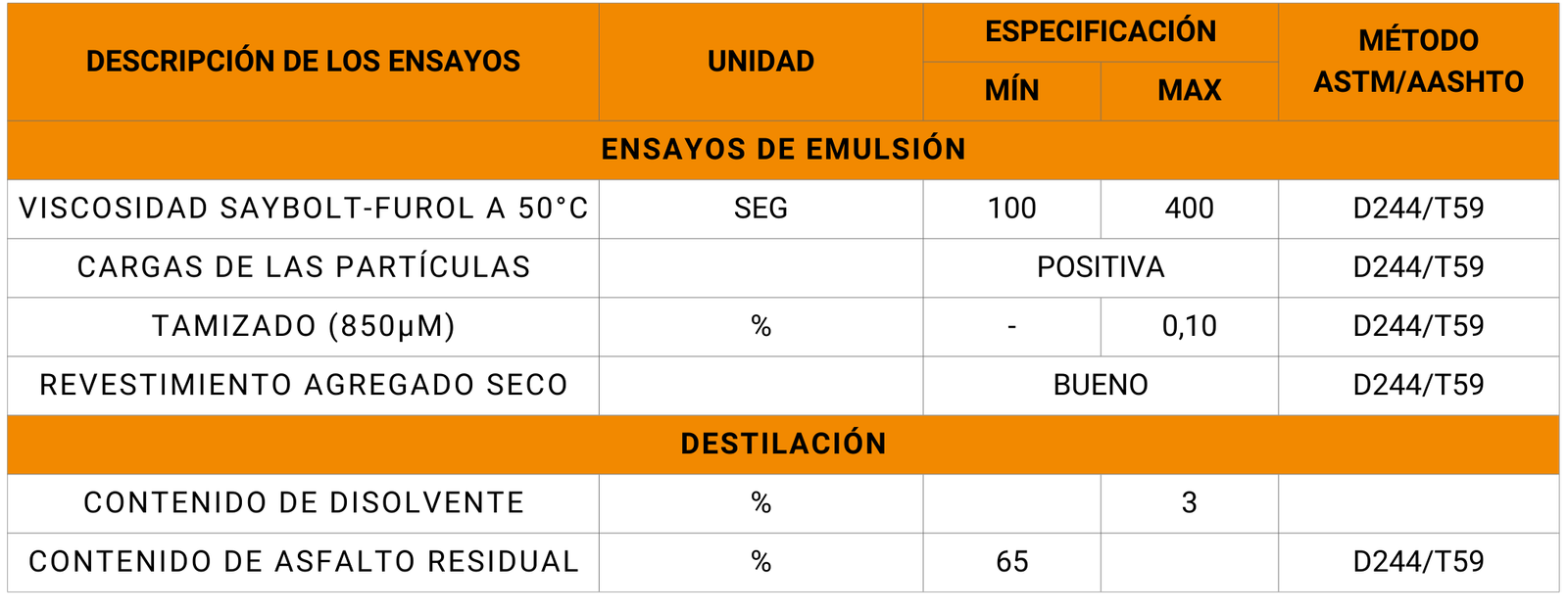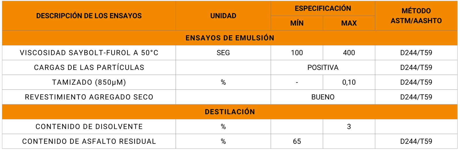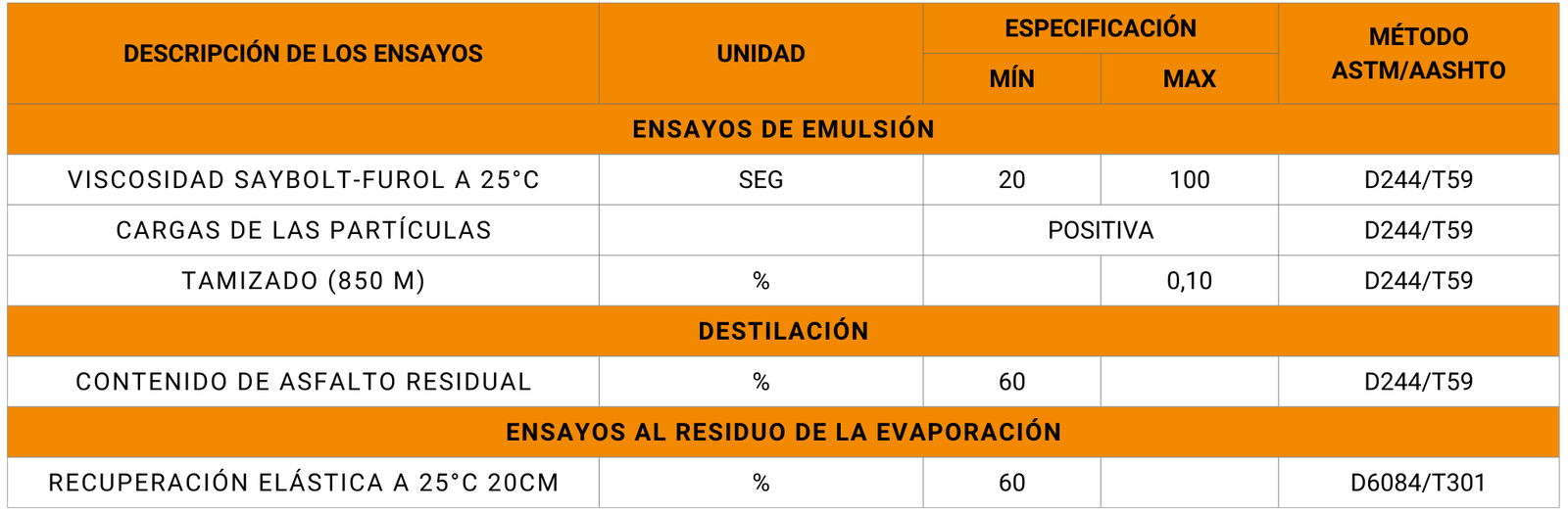 Nuestra emulsión asfáltica CQS-1H es un producto ecológico, de aplicación en frío, se fabrica de acuerdo con las normas ISSA A115 «Guideline For Polymer-Modified Emulsified Asphalt Slurry Seal» y ASTM D2397 «Standard Specification For Cationic Emulsified Asphalt». Es fabricada bajo estrictos controles de calidad, su desempeño, depende de la metodología de aplicación.