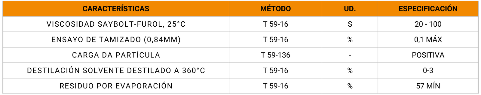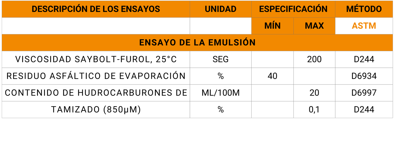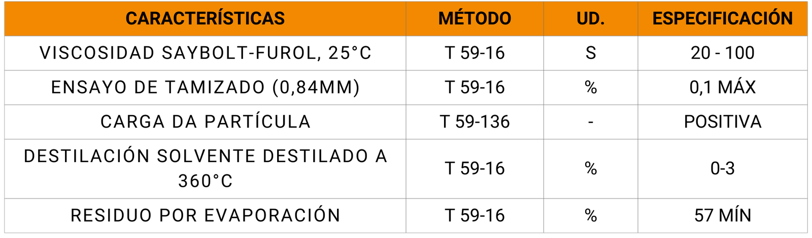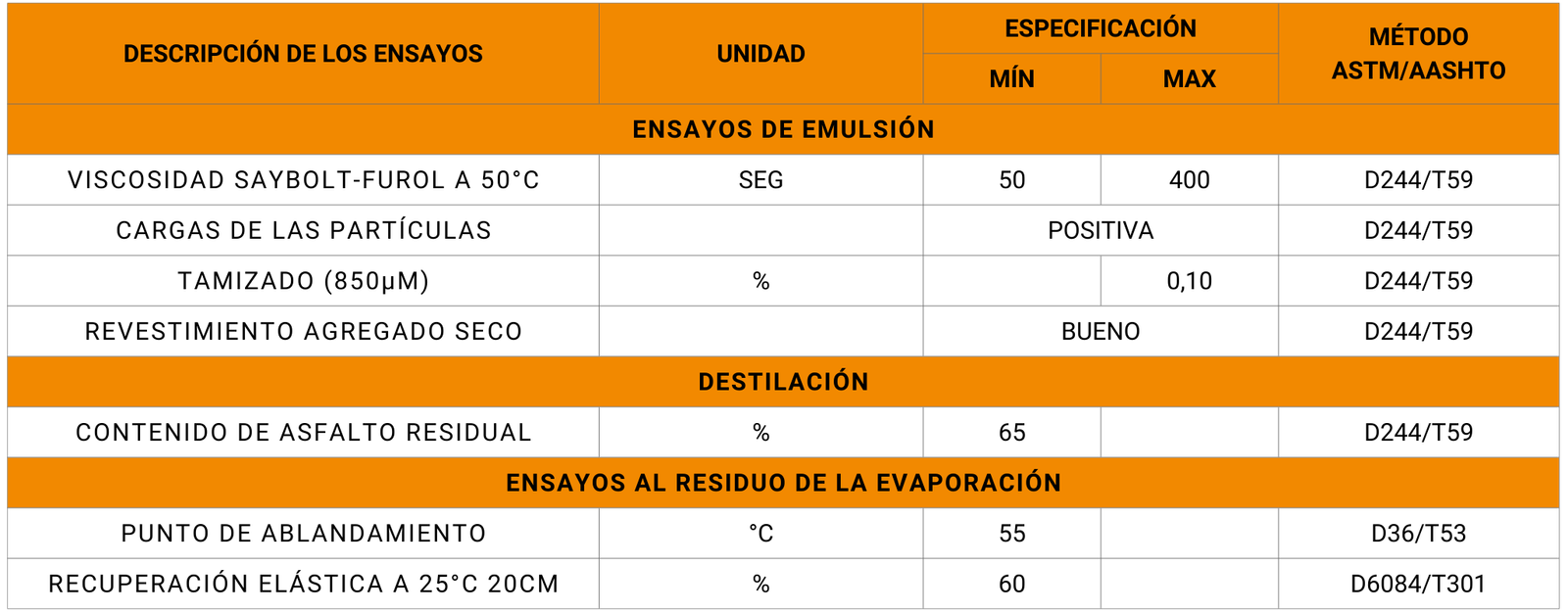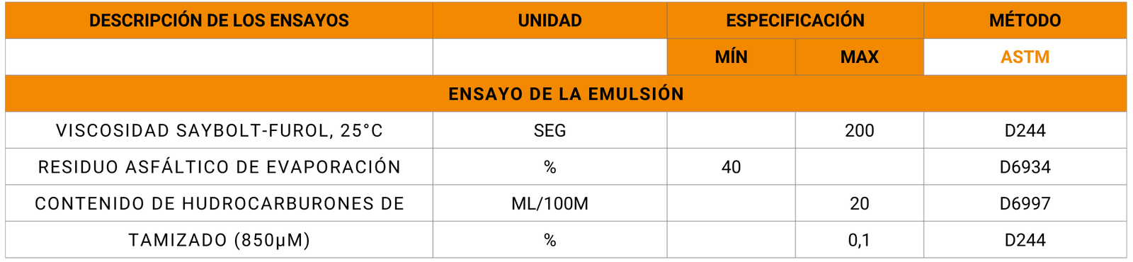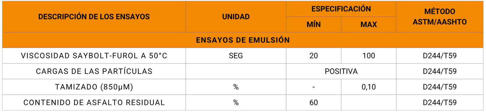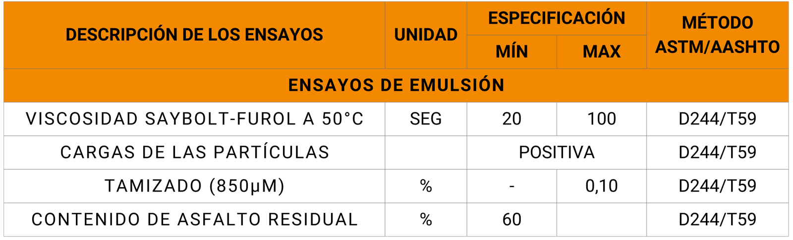 Nuestra emulsión asfáltica CQS-1H es un producto ecológico, de aplicación en frío, se fabrica de acuerdo con las normas ISSA A115 «Guideline For Polymer-Modified Emulsified Asphalt Slurry Seal» y ASTM D2397 «Standard Specification For Cationic Emulsified Asphalt». Es fabricada bajo estrictos controles de calidad, su desempeño, depende de la metodología de aplicación.